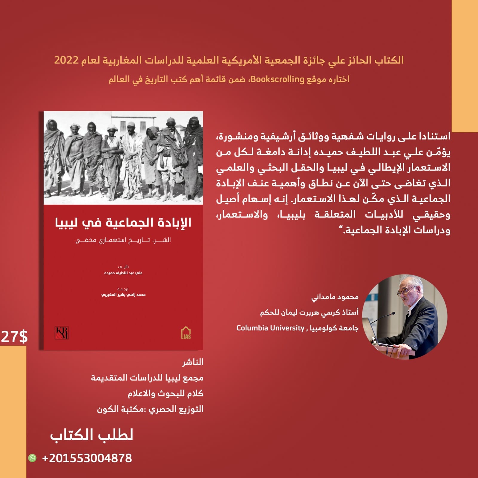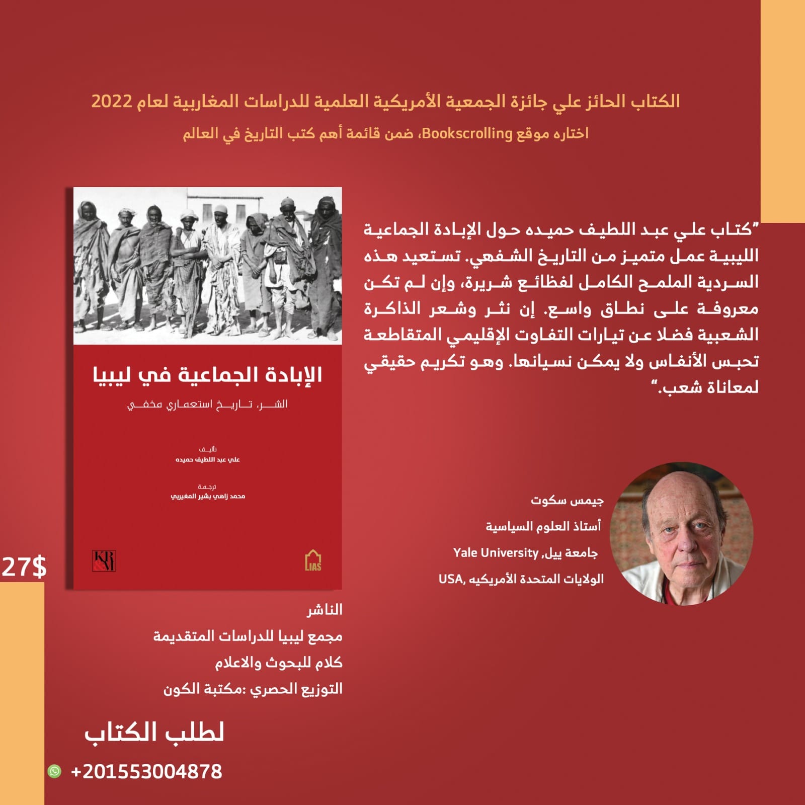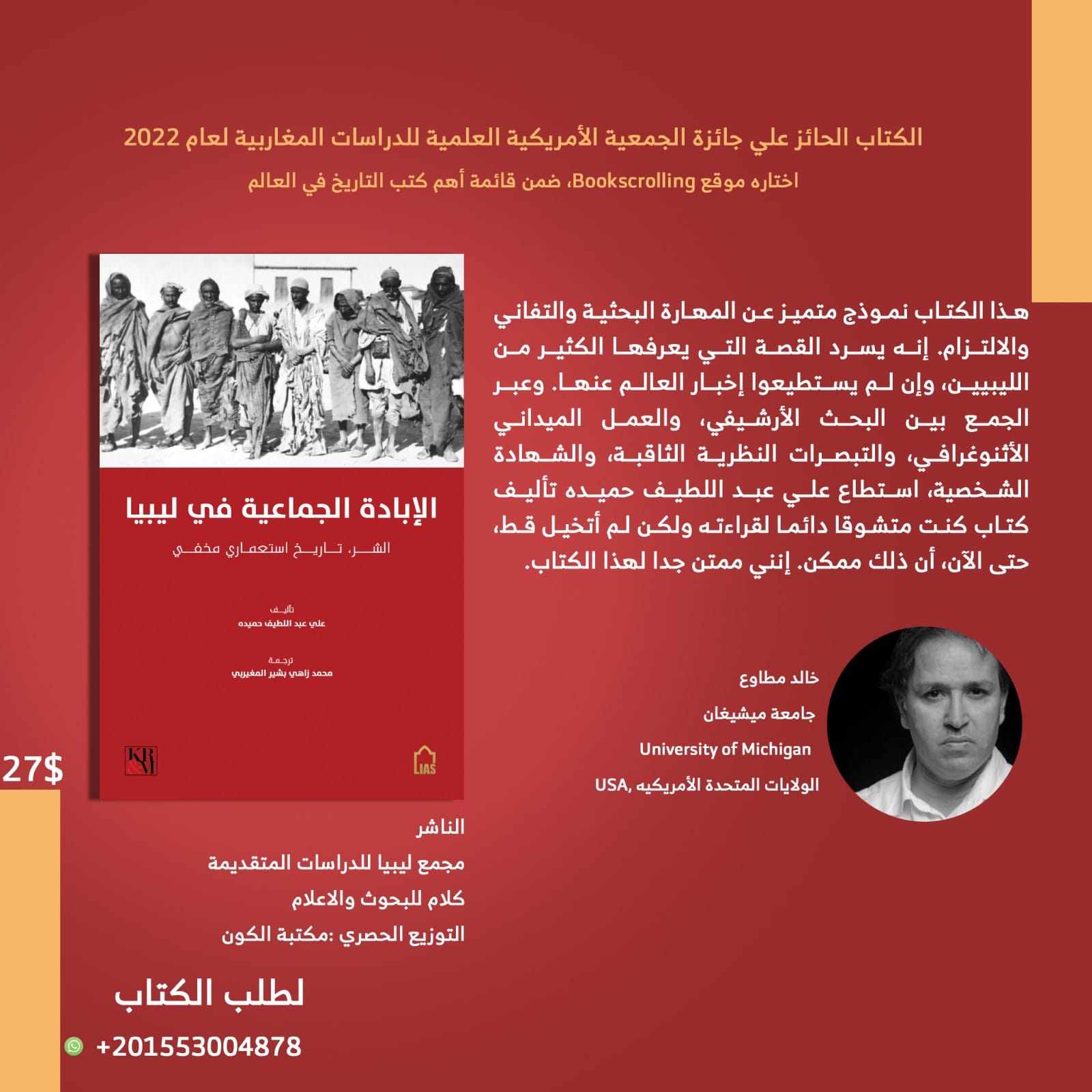 In response to repeated requests from readers to the Libya Academy and its administration, and with recommendations from (Dr. Arif Al-Nayed), Chairman of the Academy’s Board of Directors, the Libya Academy announces additional support for the price of the book: (Genocide in Libya), written by: Prof. Dr. Ali Abdul Latif Hamida, translated by: Prof. Dr. Muhammad Zahi Al-Mughairbi, for his #price to the public:
