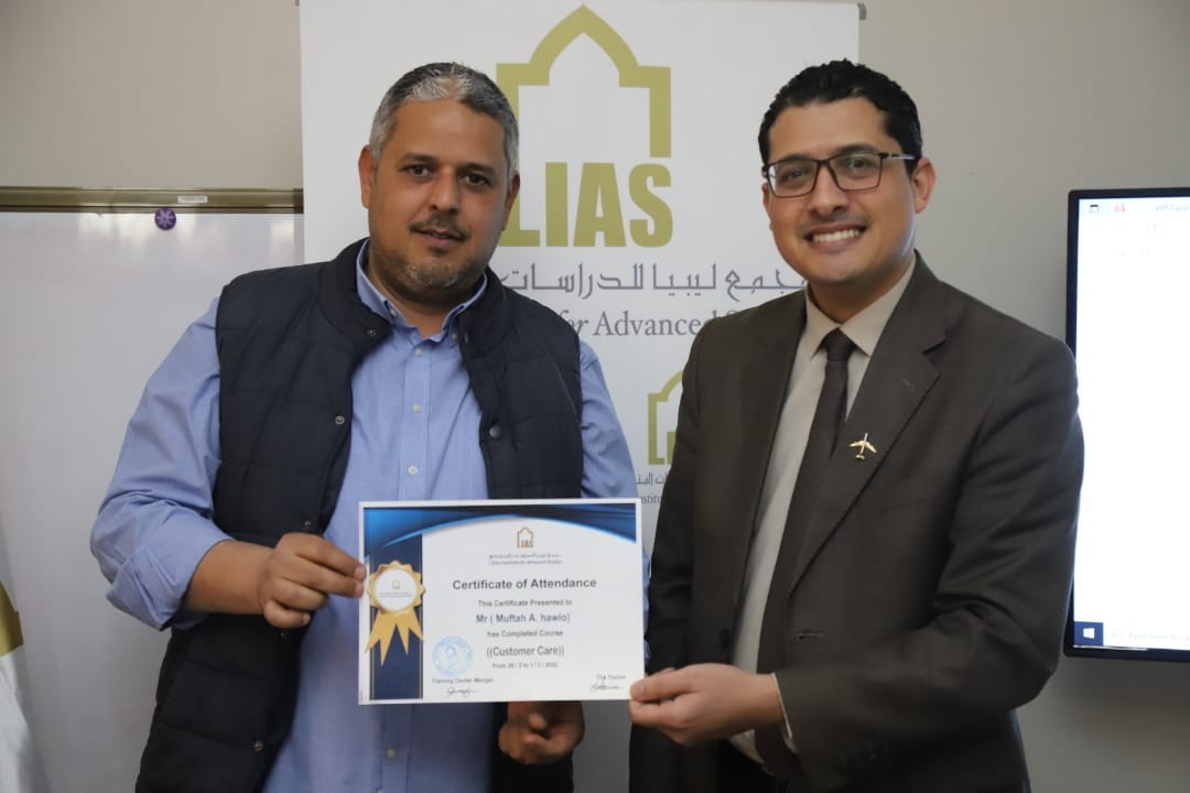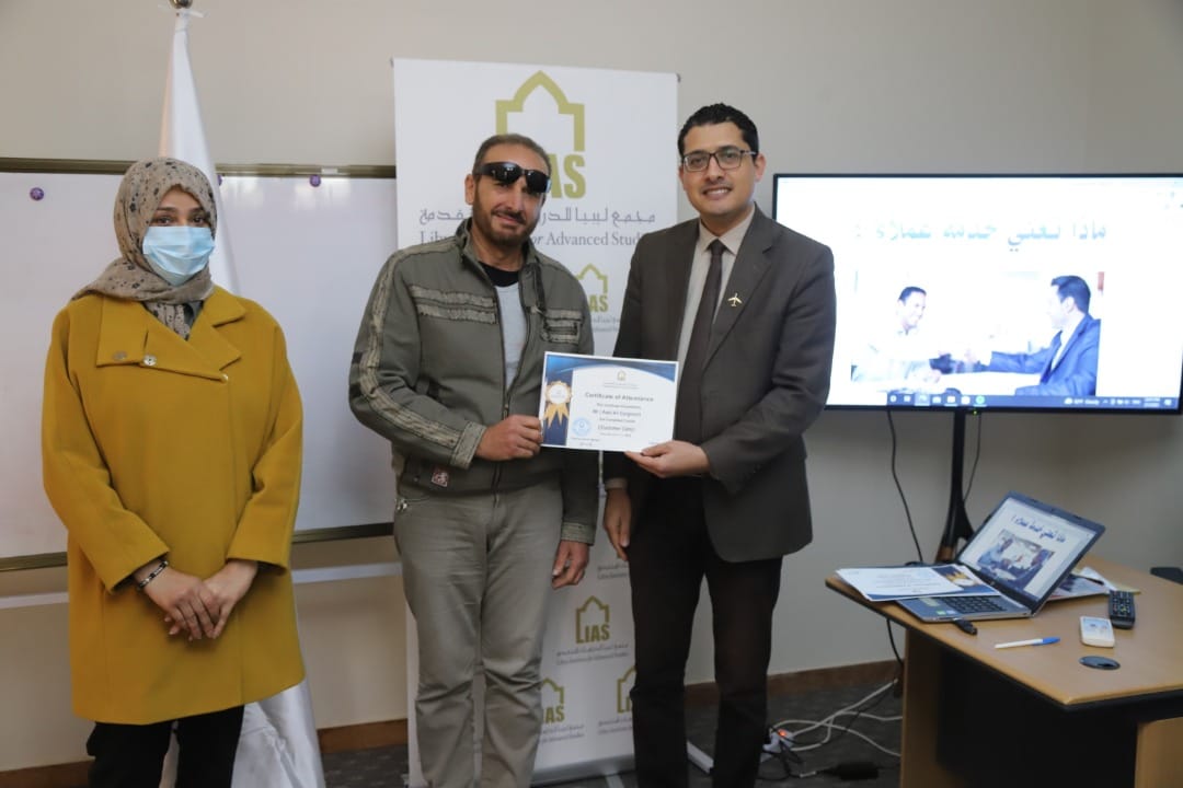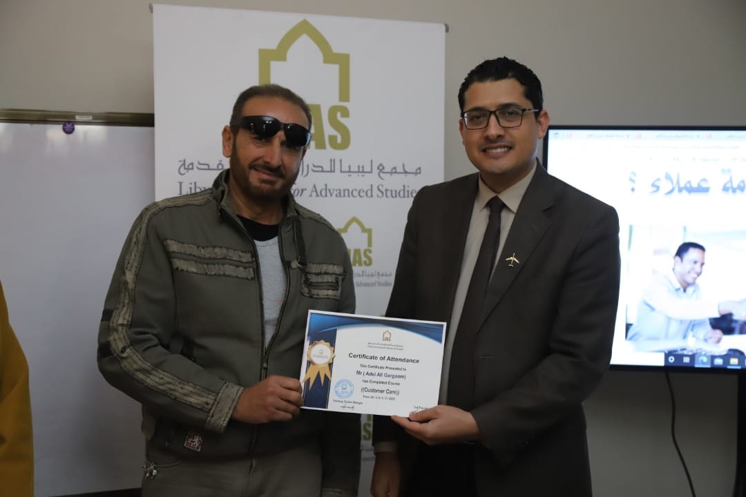 وفي نهاية ورشة العمل قام السيد/صلاح عياد العبار ” مدير إدارة التدريب بإعطاء موظفي مبيعات تذاكر السفر وخدمات الركاب بالمطار على شهادات حضور ورشة العمل.
