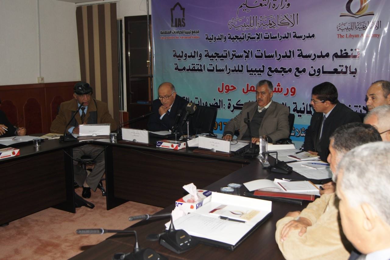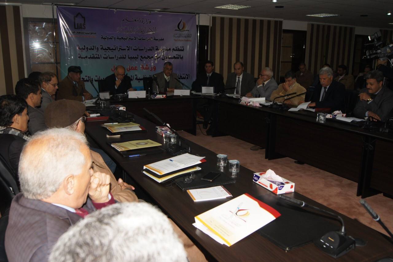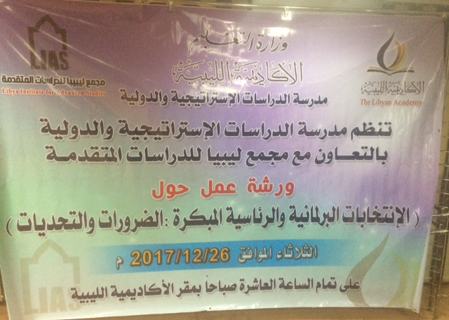 نظّم مجمع ليبيا للدّراسات المتقدّمة بالتعاون مع مدرسة الدّراسات الاستراتيجيّة والدوليّة بالأكاديمية اللّيبية جنزور 26/12/2017، ورشة عمل بعنوان: الانتخابات البرلمانية والرئاسية المبكّرة ” الضرورات والتّحدّيات”.